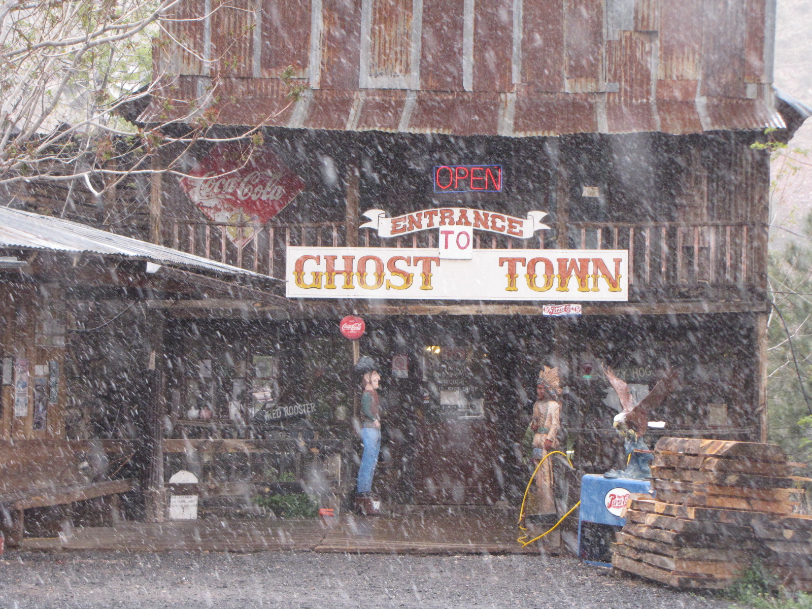We took a wonderful ride to cottonwood and then up to the town Jerome . We really loved Jerome and all the galleries. There was wondeful artwork there done by locals. It was snowing really hard and this is a picture of the entrance to the ghost town.