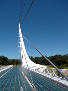 “World renowned Spanish architect and engineer Santiago Calatrava conceived the Sundial Bridge’s unusual design, his first free-standing bridge in the United States. Calatrava has built bridges, airports, rail terminals, stadiums, and other structures around the world. His notable designs include the new PATH transportation terminal at the World Trade Center site in New York City and several projects at the 2004 Olympic Games in Athens, Greece, including the main stadium where opening and closing ceremonies were held.” See more about the bridge at  http://www.turtlebay.org/sundialbridge.
