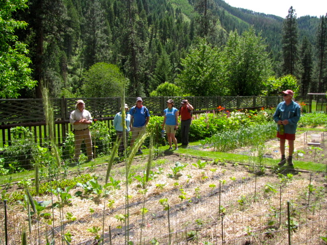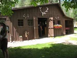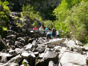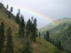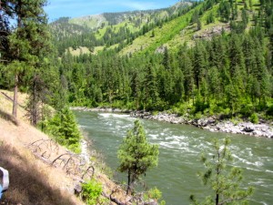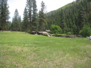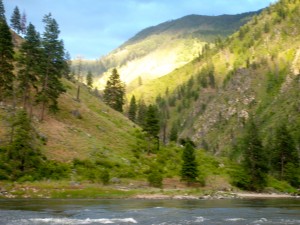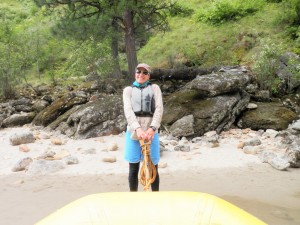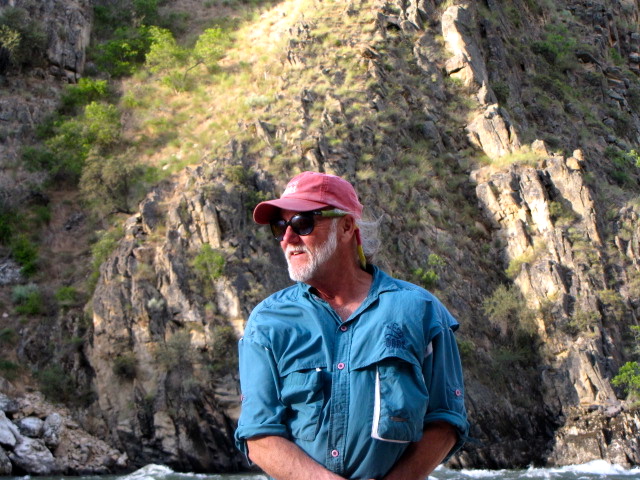 Today John decided to take the kayak again and I paddled. We started out with a couple big rapids then hit Elk-horn. This is a long and rocky rapid and John got thrown out of his kayak at the top of it. Being in the paddle boat we were , also the rescue boat. It was scary watching John bopping in and out of the water hanging on to his oar and kayak the whole way. With Becky’s expertise we paddled over to John and got him up on our boat. He was cold and tired, but after 5 minutes he was ready to get back in that ducky and paddle some more. He was not going to let the river beat him!! We stopped for lunch and a hike up to Jim Moore’s Place. He lived here 40 years selling beef, hides and vegetables to Thunder Mountain Mine.He died in 1942 and is buried on his property.
