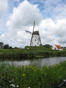 Leaving Bruges to bike along the river and countryside. I love this picture with the windmill and clouds reflecting in the water.
