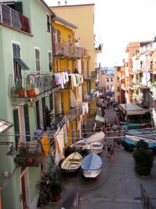 The pretty town of Manarola. Where do you go and see boats parked on the street and the laundry hanging is part of the scenery.